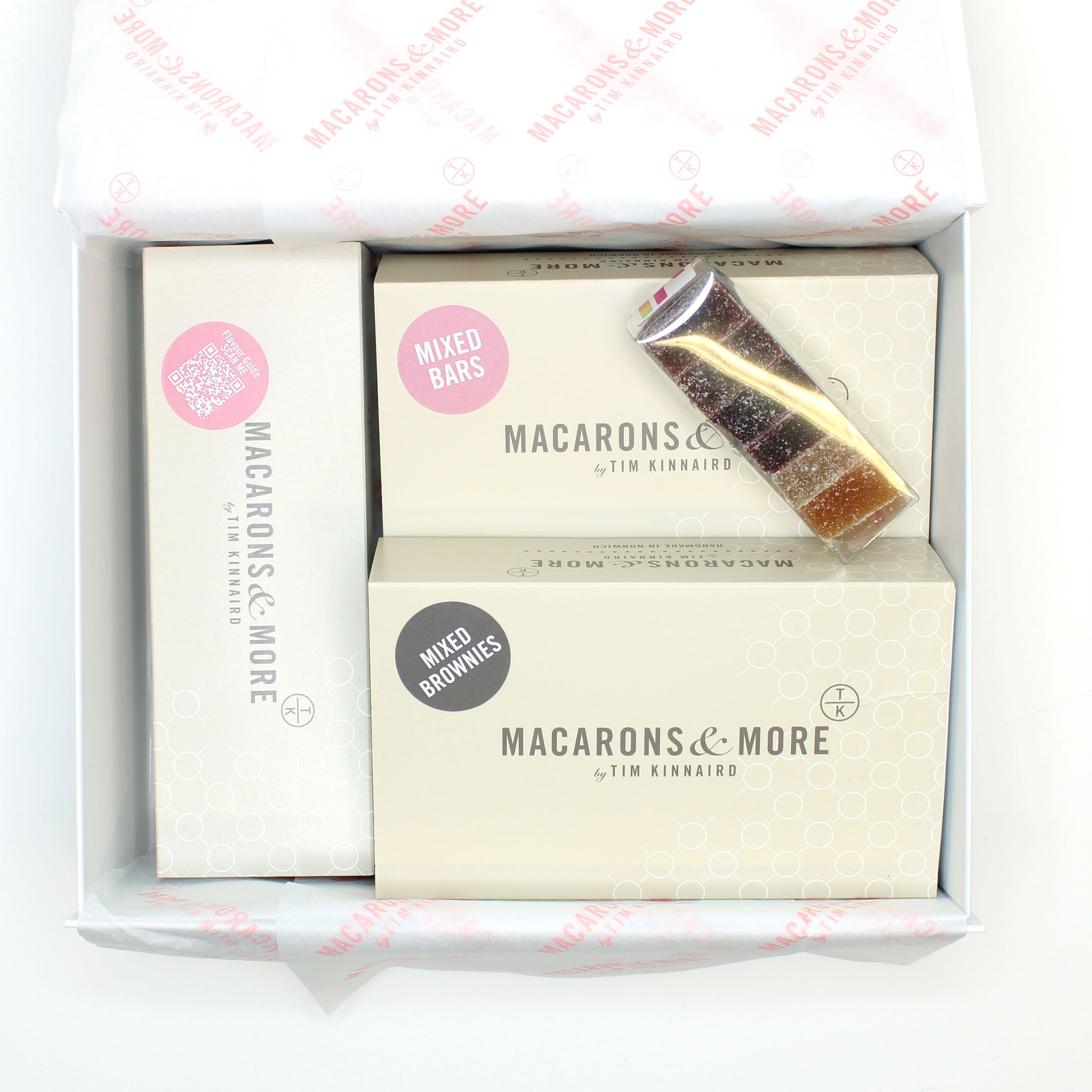 Our taster boxes are the perfect way to try each of our product ranges. Each gift box contains our favourites flavours of Macarons, Brownies, Bars and Pâte de Fruit Jellies. Beautifully packaged and delivered next day to you or straight to your giftees door.